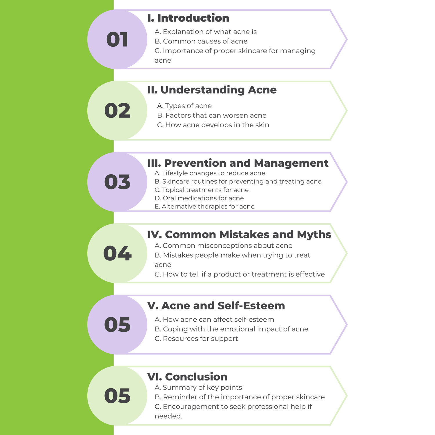 This book is a comprehensive guide that covers all aspects of managing acne, from understanding its causes and types, to implementing effective prevention and management techniques. It includes information on lifestyle changes, skincare routines, topical treatments, oral medications, alternative therapies, and addressing the emotional impact of acne. The guide debunks common misconceptions and mistakes in treating acne, and provides readers with the knowledge to make informed decisions about their skincare. This e-book is the ultimate resource for anyone looking to achieve clear, healthy skin and a clearer mind.